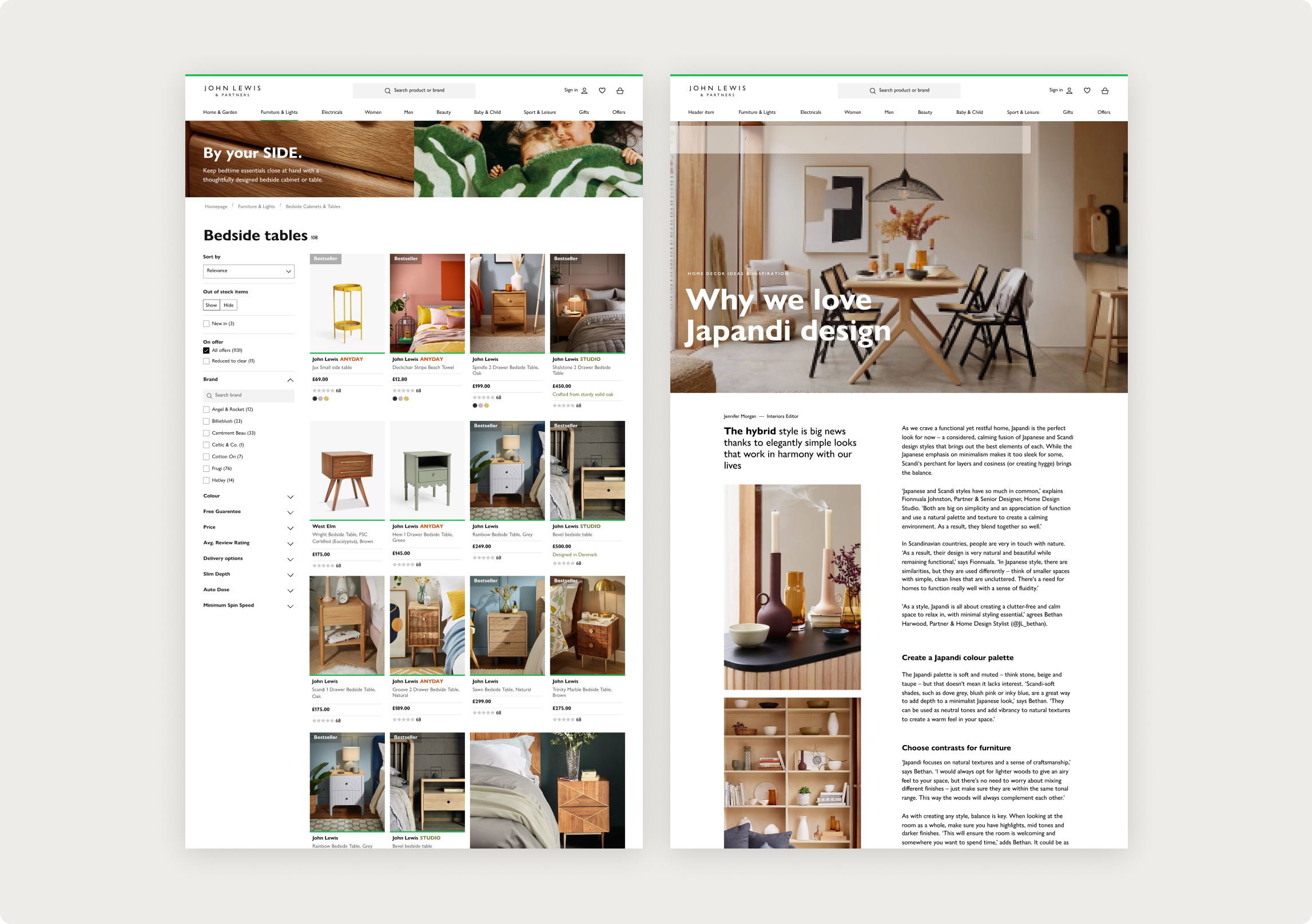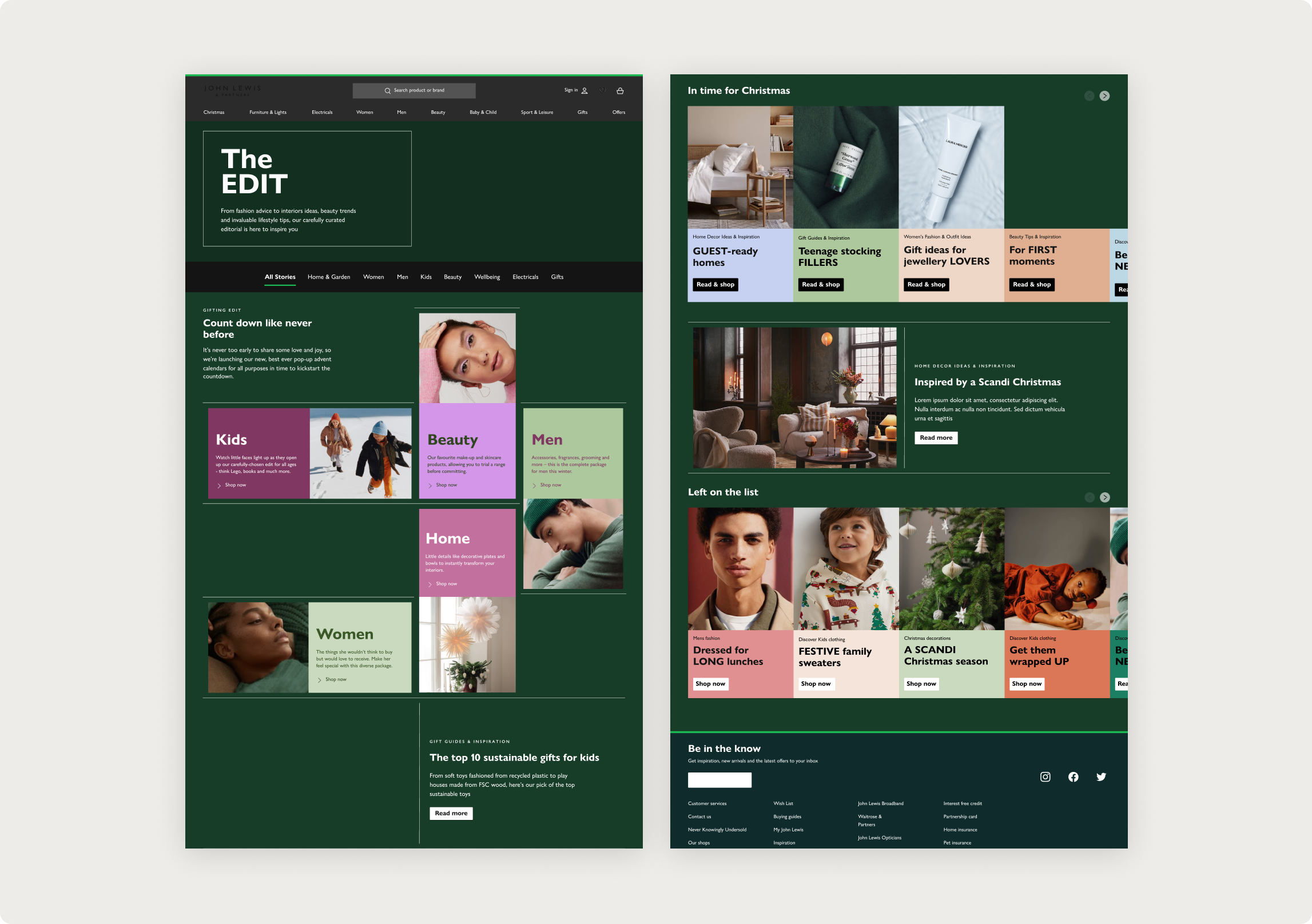 By the end of 2021, I led the team in reimagining the ethos of the department store for the digital age, helping customers rediscover the joy of shopping. Our focus was on crafting a design that evoked inspiration, curation, convenience, and expert advice—capturing the emotional excitement felt by John Lewis’s first customers over 100 years ago. This vision drove a 16-week Brand UI Refresh, during which I guided the team through strategic immersion, defining a bold creative vision, and fostering open collaboration through ‘town-hall’ sessions on brand, customer insights, and content strategy. Through workshops with John Lewis designers and developers, I championed the idea of prioritising ‘unity’ over ‘uniformity,’ empowering the team to push creative boundaries while delivering a refreshed, cohesive brand experience.